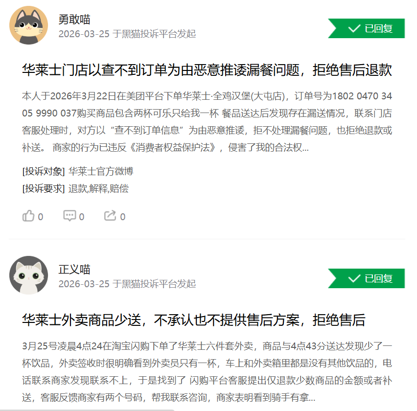 正在办事方面,华莱士正在黑猫赞扬等平台的赞扬,也是密密层层。不少消费者反馈,其外卖办事存正在漏单、少送产物等问题。可是消费者取商家沟通时,商家却以查不到订单、不认可少送等为由售撤退退却款。此类问题,明显会严沉影响华莱士的品牌信赖度取消费者好感。